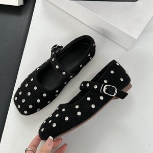 2025年秋冬季新款时尚时装鞋方头水钻一字带豆豆芭蕾平底软底单鞋