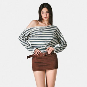 Q25TP308外贸秋季新款女装慵懒风斜肩条纹蕾丝收腰短款长袖上衣