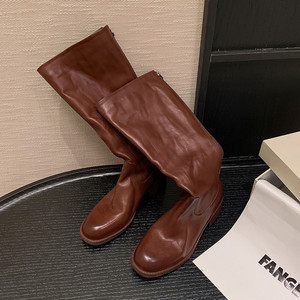 头层牛皮骑士靴女擦色靴子冬新款真皮圆头粗跟中跟后拉链及膝靴女