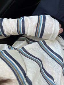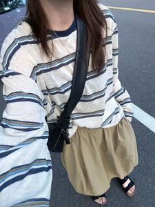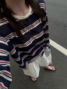 【工厂现货】复古圆领撞色长袖条纹t恤女薄宽松慵懒百搭防晒罩衫