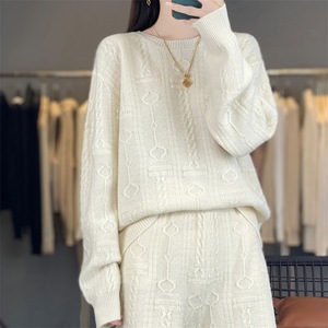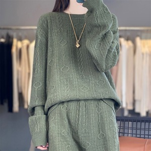 2025新款100羊毛女圆领加厚扭花套装短裤秋冬新款保暖简约俩件套