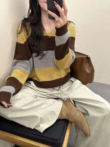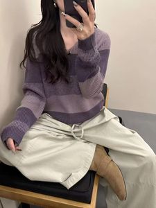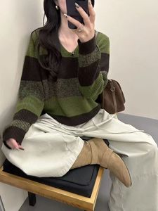 濮院工厂秋冬新款V领条纹拼色绿色毛衣花纱休闲宽松打底衫韩女装