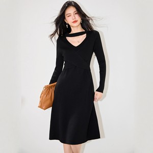 R5905气质黑色挂脖V领连衣裙女秋长款气质赫本风修身内搭毛衣裙
