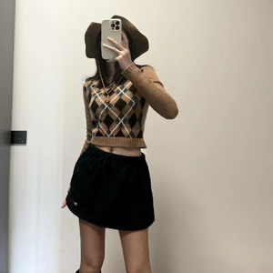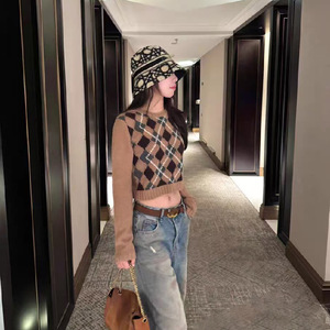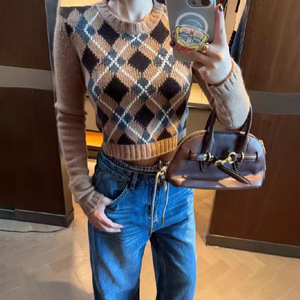 P家秋冬新款复古撞色菱格纹圆领长袖针织衫修身显瘦百搭毛衣上衣
