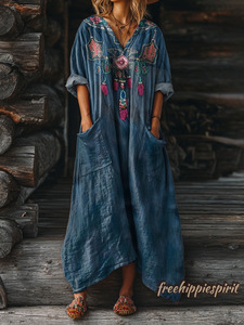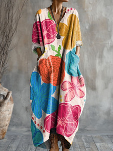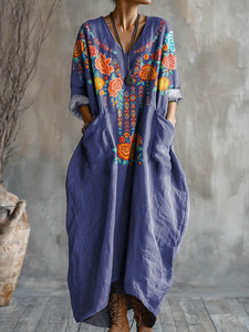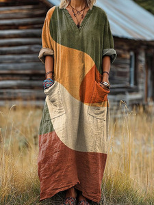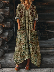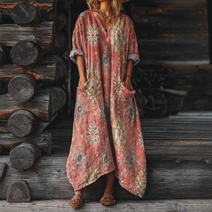 2025新款独立站女式复古花卉艺术风格数码印花V领口袋连衣裙