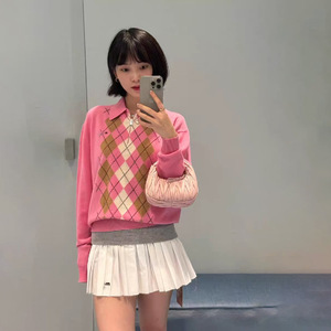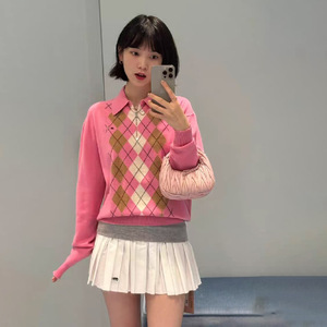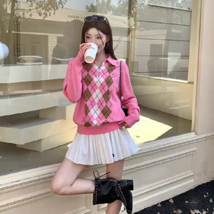 M家秋冬季新款字母徽标撞色菱格半拉链长袖针织衫粉色甜美毛衣女