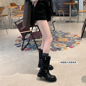 葡萄妈冬季新款水洗牛皮扣带厚底马丁靴2025褶皱酷酷骑士靴子女