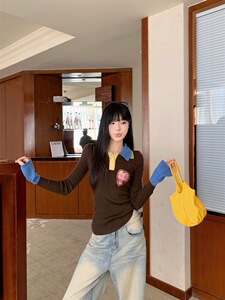 小众别致撞色气质长袖针织衫女装秋季修身显瘦chic上衣内搭打底衫