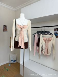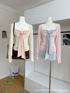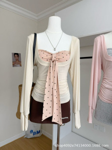 纯欲风杏色方领长袖T恤女秋季收腰褶皱打底衫内搭chic甜辣妹上衣