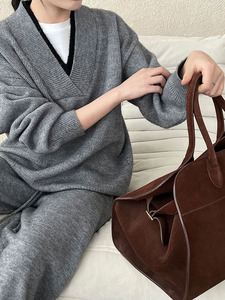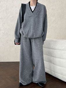 鹿西 复古松弛感拼接V领撞色针织衫+阔腿裤秋季新款宽松套装ss819