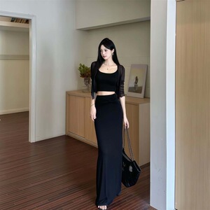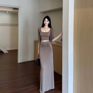 御姐风长袖早秋开衫双肩带吊带背心高腰拼接扭结半身裙三件套装女