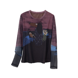 韩版卡通风 猫咪印花网纱弹力长袖T恤女圆领显瘦百搭减龄上衣小衫