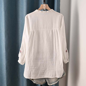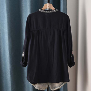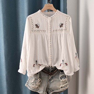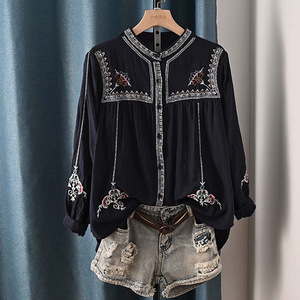 复古刺绣民族风立领双层棉纱长袖衬衫新款宽松百搭上衣衬衣女装