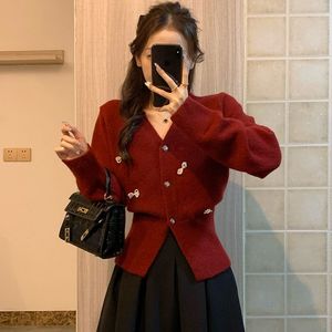 软糯珍珠针织衫女收腰新年红色开衫外套安可拉上衣毛衣V领蝴蝶结