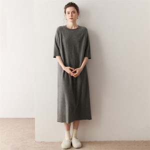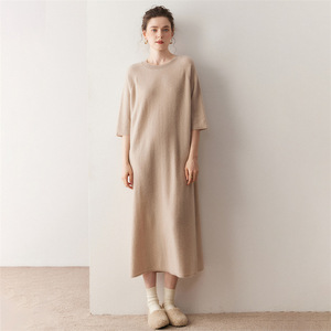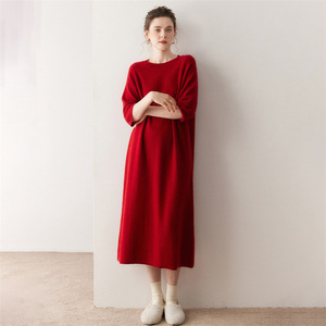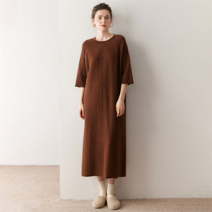 山羊绒连衣裙秋冬新款女圆领针织毛衣裙子遮肉显瘦七分袖套头长裙