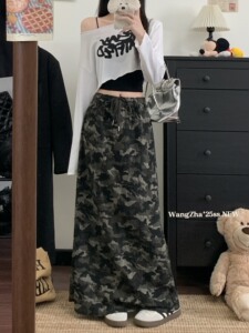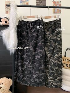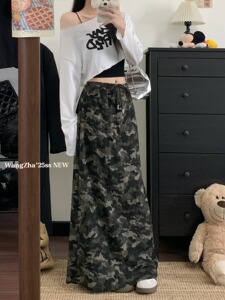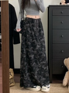 美式复古迷彩抽绳直筒半身裙女秋季新款休闲时尚显瘦垂感破洞长裙