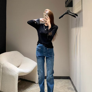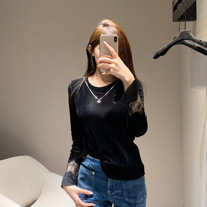 秋冬新款双C链条丝绒蕾丝拼接袖口T恤时尚气质百搭长袖打底衫上衣