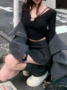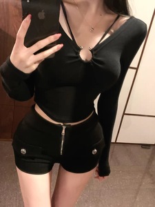 【人间白茶】韩女镂空设计纯欲v领修身显瘦T恤上衣外穿