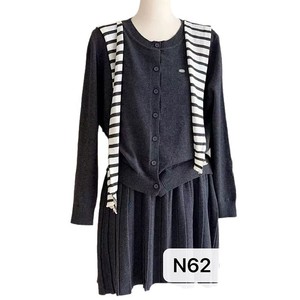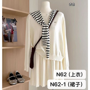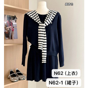 韩系早秋穿搭一整套慵懒风针织开衫女+百褶短裙+条纹披肩三件套装