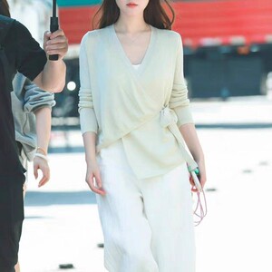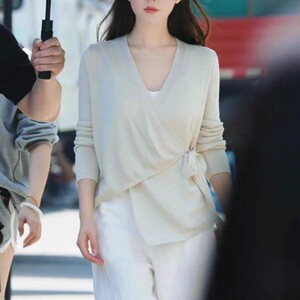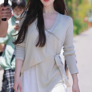 许我耀眼赵露思同款不规则V领针织衫慵懒交叉系带长袖开衫薄款新