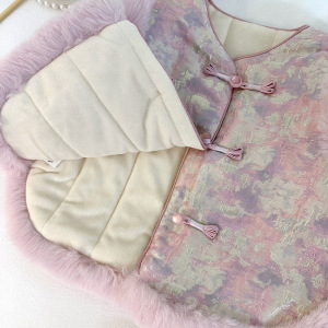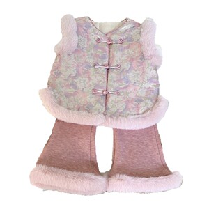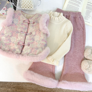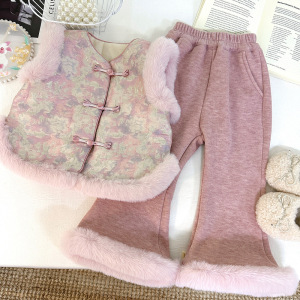 女宝中国风套装加绒冬季2025新款加厚毛毛边马甲微喇叭裤两件套潮