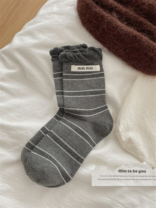 25秋冬英文布标ins甜美泡泡口韩系少女堆堆袜秋冬条纹纯棉袜子