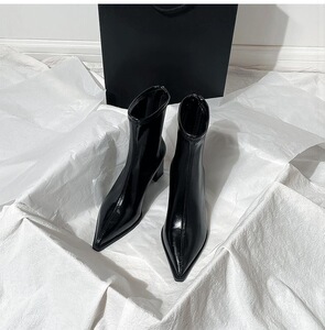 棕色短靴女高跟秋冬新款加绒法式小踝靴后拉链弹力尖头粗跟瘦瘦靴