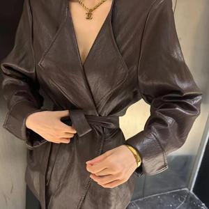 欧洲站感穿宽松绑带纯色长袖皮质外套女秋季新款小众上衣