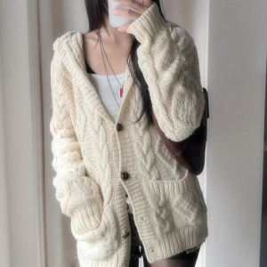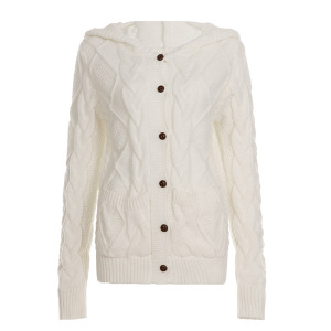 外贸复古麻花连帽毛织排扣简约纯色上衣宽松慵懒百搭休闲长袖外套