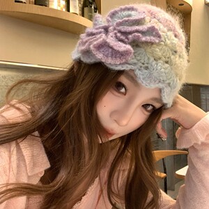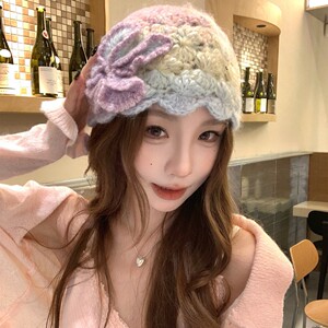 彩色渐变手工钩花帽子女镂空针织包头帽秋冬保暖显脸小毛线帽冷帽