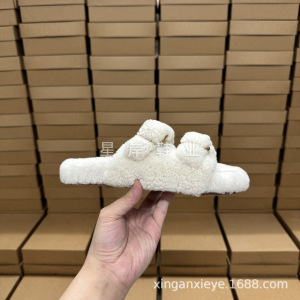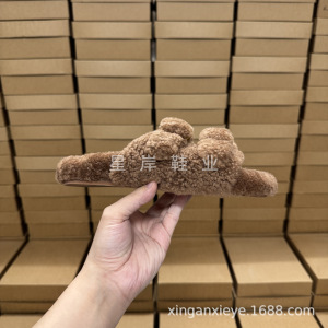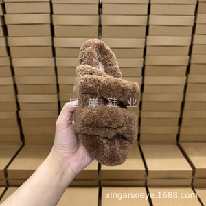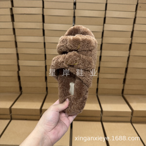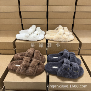 河南桑坡2025新款秋冬季金属扣保暖舒适百搭平底二字拖毛毛拖鞋女