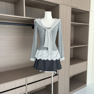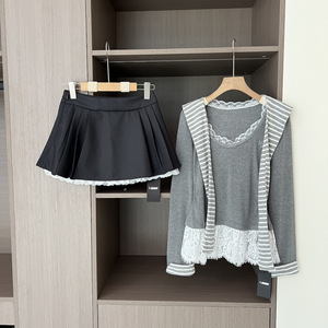 塞纳辣妹修身条纹坎肩蕾丝T恤女2025秋季新款长袖上衣+半身裙