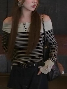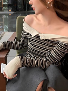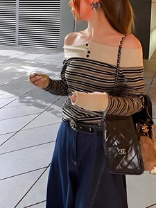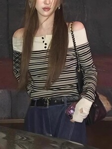 2025秋季软糯慵懒风韩系设计感小众不撞款绝美一字肩条纹针织衫女