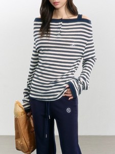 iNSLiiSA 条纹甜辣风一字肩长袖t恤女假两件显瘦休闲慵懒风上衣