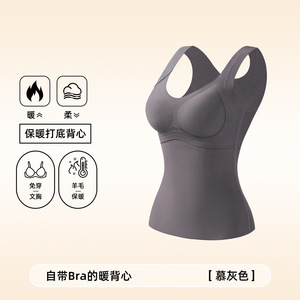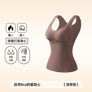 秋冬羊绒蚕丝无痕保暖背心女带胸垫一体免穿文胸加绒加厚打底衫女