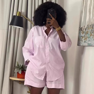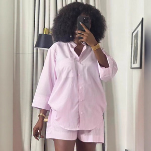欧美女装粉色条纹翻领开衫衬衫休闲短裤套装非洲大码时尚两件套女