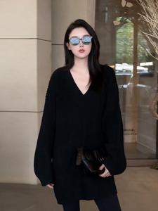 慵懒高级感黑色中长款v领套头毛衣女韩系休闲显瘦百搭气质针织衫