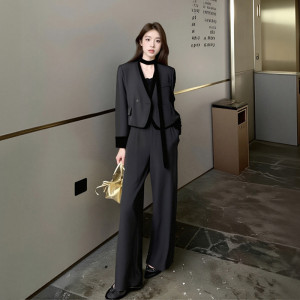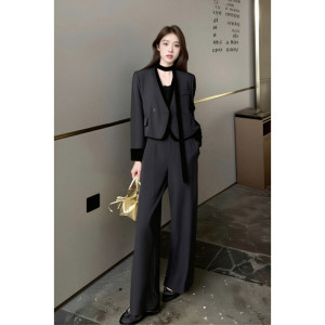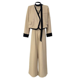 2025跨境假两件撞色拼接V领西装短外套套装女时尚阔腿裤两件套