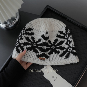 100%澳洲羊毛2025新款安可拉红复古针织提花文艺风护耳显脸小保暖
