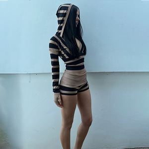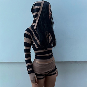 跨境亚马逊时尚辣妹美式条纹撞色V领连帽上衣短裤套装修身高级感