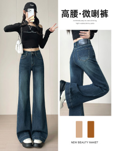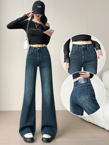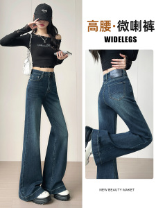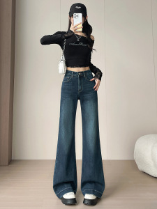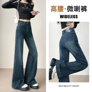 复古蓝刺绣大阔腿牛仔裤女春秋季新款高腰宽松拖地喇叭裤子弹力