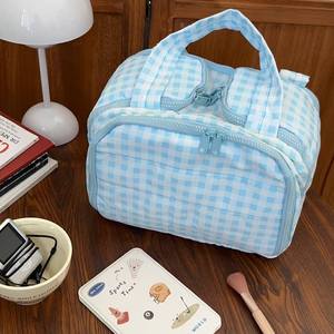 简约蓝格子开口洗漱包大容量立体分区化妆包便携旅行化妆品收纳包