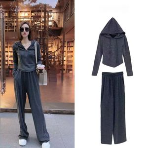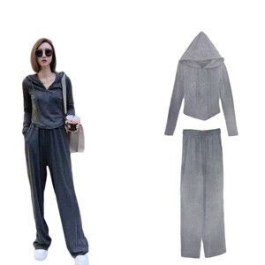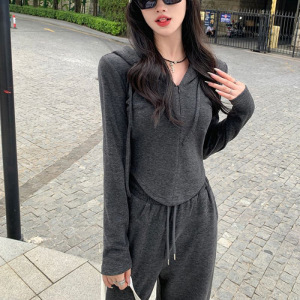 休闲流行休闲套装秋冬季新款纯色拉链短款连帽开衫卫衣两件套女装