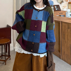 韩系撞色格纹圆领针织开衫女秋冬新款宽松慵懒风大码胖MM毛衣外套