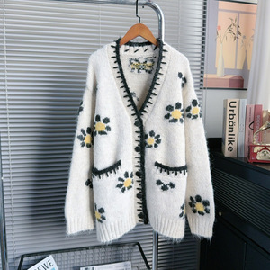 手工钩花V领针织开衫秋冬季新款慵懒风高级感显瘦花朵毛衣外套女