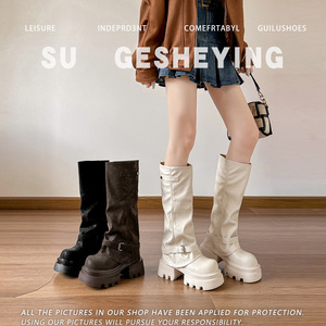 美拉德棕色靴子长筒靴女粗腿高筒骑士靴小个子厚底显瘦裤管堆堆靴