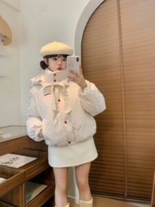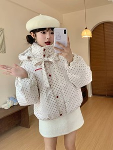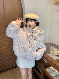 甜美蝴蝶结波点连帽棉衣外套冬季新款保暖加厚面包服棉服女短款潮