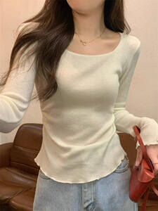 小个子木耳边喇叭袖长袖t恤上衣女秋季新款甜美风方领修身打底衫