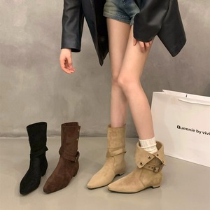 粗跟复古绒面西部牛仔卡其色短靴女靴子2025春秋季单靴方头马丁靴