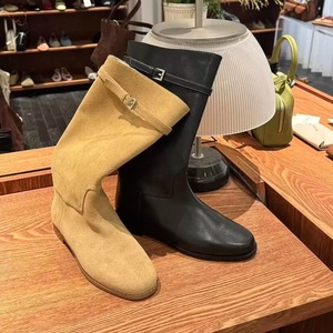 牛皮版~25年新款韩版圆头磨砂皮软面长筒靴女百搭粗跟气质骑士靴